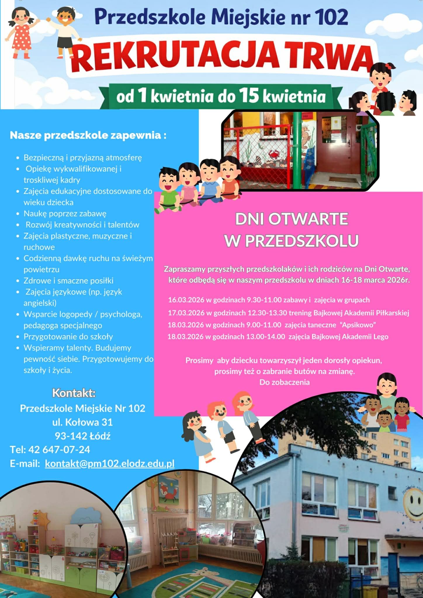 16 marca - od godziny 9:30 do 11:00 różnorodne zabawy w każdej z grup, spotkania organizacyjne z nauczycielami;