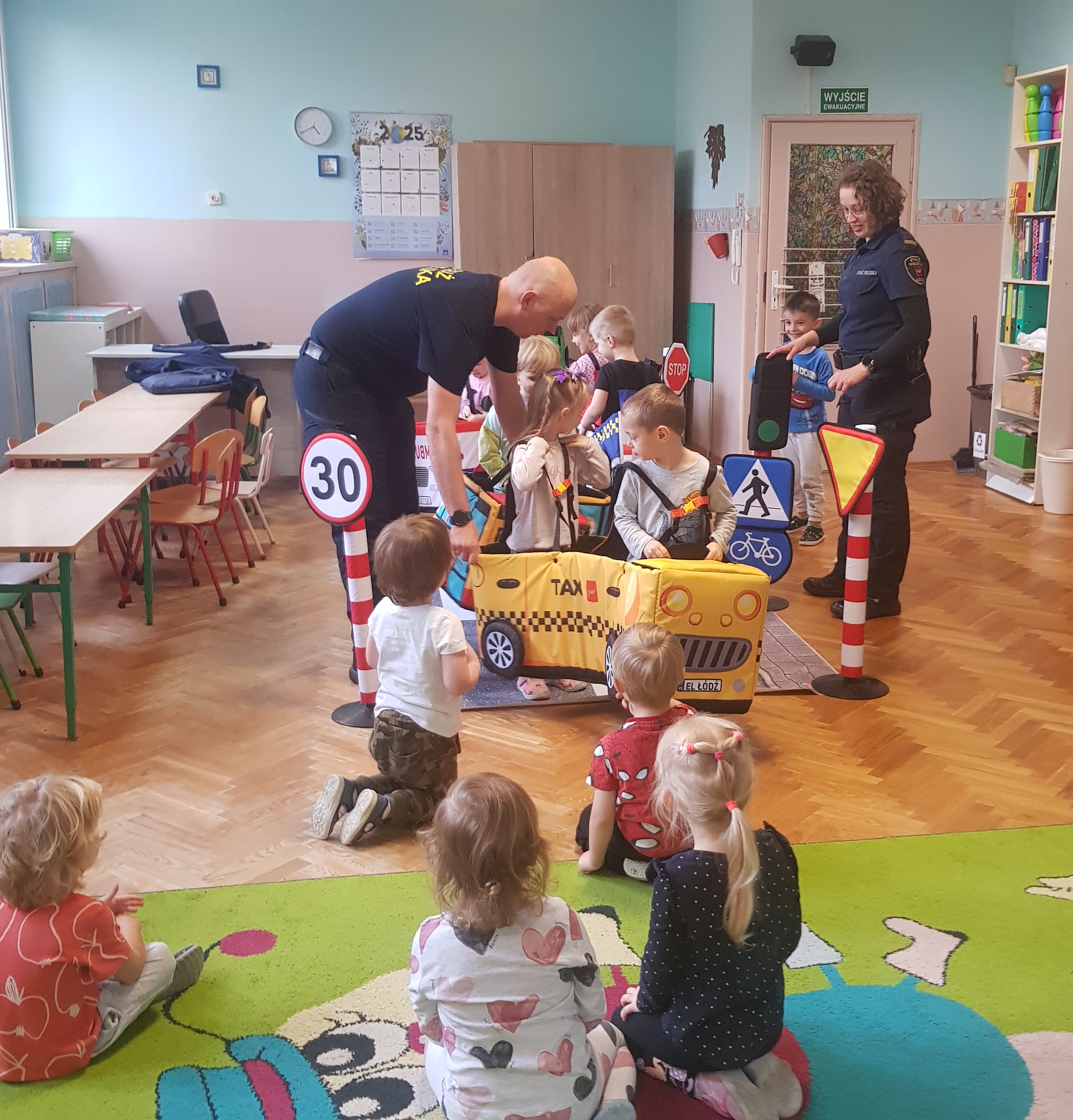Nasze przedszkolaki dowiedziały się o najważniejszych zasadach bezpieczeństwa na drodze. Noszenie odblasków, jak zachowywać blisko ulicy, przechodzić przez jezdnię.
