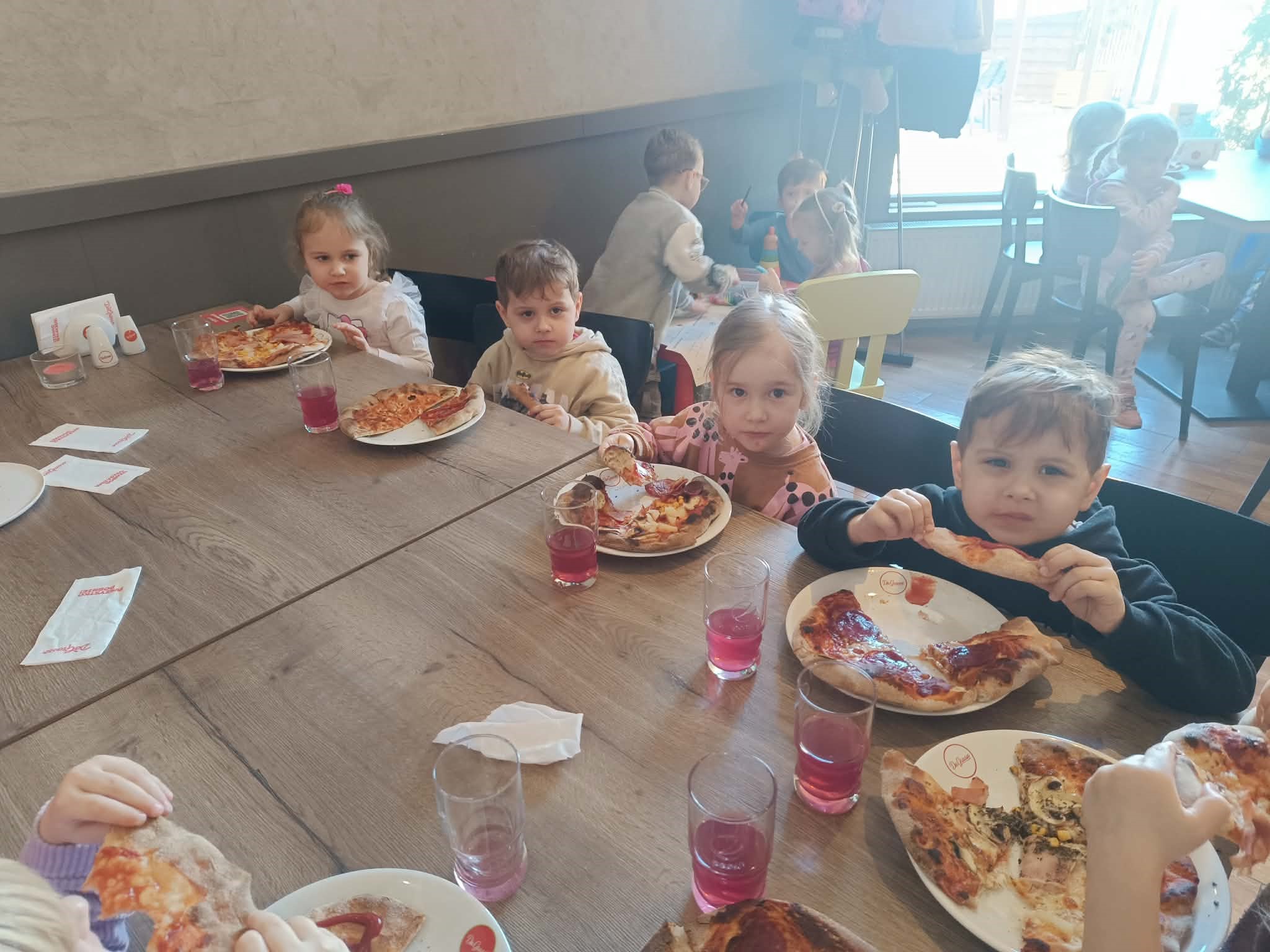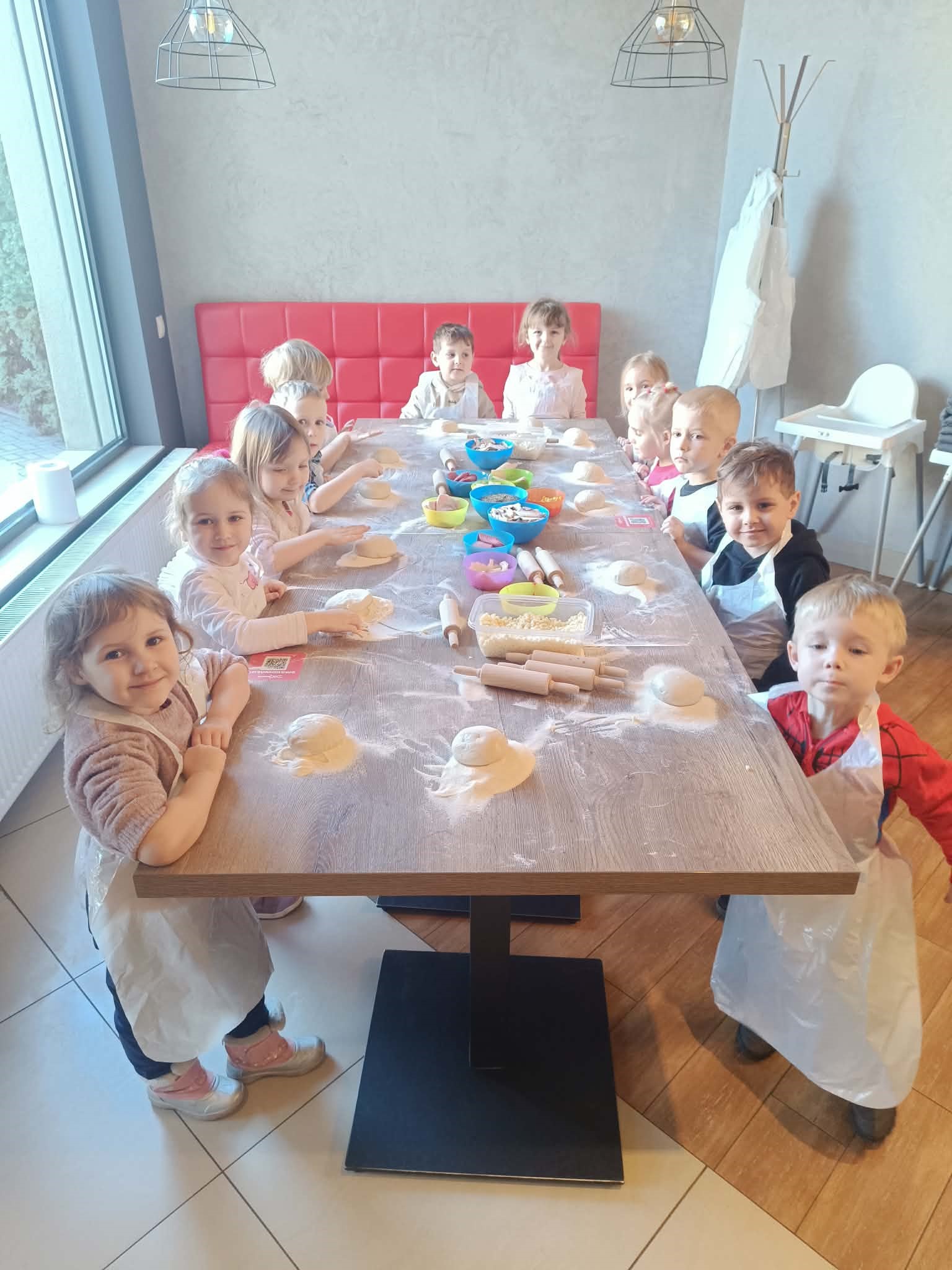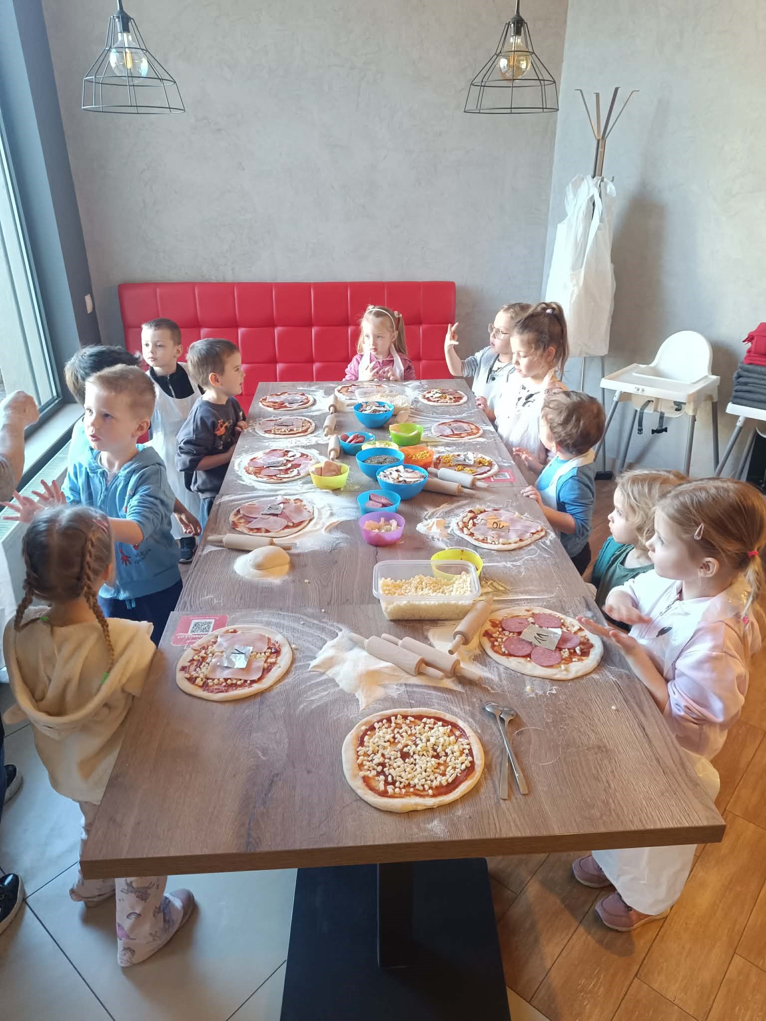 Warsztaty kulinarne, podczas których dzieci z grupy pomarańczowej miały okazję wcielić się w rolę prawdziwych pizzaiolo. Najwięcej radości przyniosło oczywiście samodzielne przygotowywanie pizzy. Dzieci z ogromnym zaangażowaniem wyrabiały ciasto, podsypywały mąką stoły i uczyły się formować okrągłe placki. Choć nie wszystkim od razu udało się uzyskać idealny kształt, uśmiechy na twarzach świadczyły o świetnej zabawie.